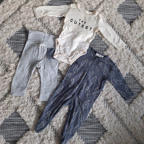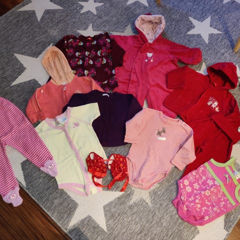 Tytön käyttövaatteet 68cm, valkoinen body kyllä pienempi. Ukin kulta- ruokalappu.