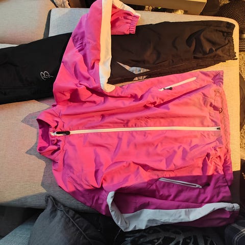 Housuissa ja takissa vetoketjuin avattavat taskut, kiristettävä vyötärö, avattavat lahkeensuut, tuulenpitävä etuosa hiihtohousuissa….