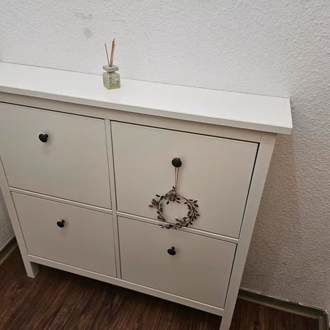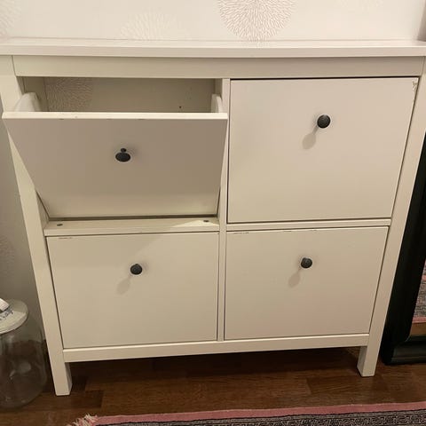 Uutta kotia etsii Ikean Hemnes kenkäkaappi. Käytön jälkiä löytyy, mutta pienin meikkaamisin (musta/tummanruskea tussi tai muu vastaava) saa varmasti jäljet peitettyä jos ne häiritsee. Kaapissa on jalat vain etureunassa, joten sen voi sijoittaa huoneen jalkalistasta huolimatta aivan kiinni seinään ja se pitää kiinnittää seinään oman seinämateriaalin mukaisesti (ruuvit ei tule mukaan tästä syystä). Kumpaankin isompaan lokeroon mahtuu kaksi kenkäriviä ja ylinnä matala vetolaatikko vaikka kenkien hoitotuotteille.