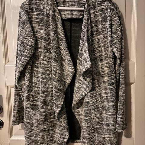 H&M:n VILLAKANGASTYYPPINEN takki joka ei kuitenkaan sisällä villaa. Meleerattu sävy. Joitakin langannousuja, mutta sellaisia ettei pääse purkaantumaan.