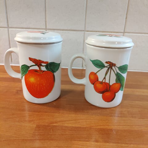 Kannellinen teemuki 70 - luvulta. Korkeus 9,5 cm ilman kantta.