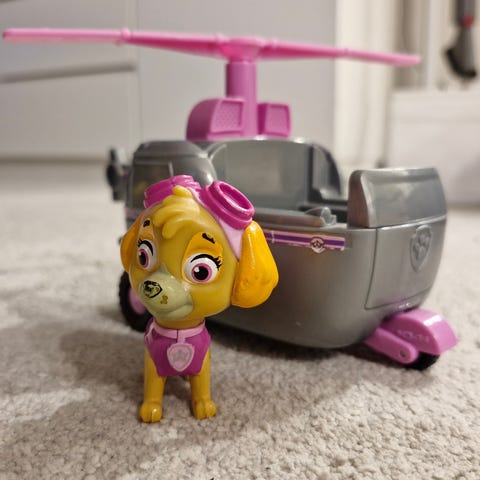 Ryhmä Hau Kaja ja helikopteri. Tässä on jo paljon leikin jälkeä. Kopterin takana olevasta napista painamalla kopterin siivet pyörivät.