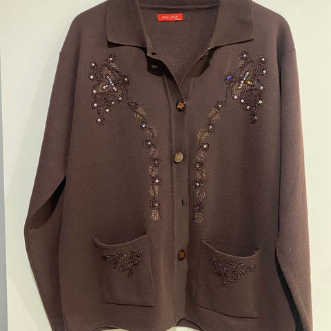 Lyhythihainen neuletakki beige/harmaa, koko XL. Alin nappi puuttuu.