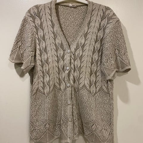 Vaaleanruskea/beige neule, jossa kukkia. Koko XL ei ole koko lappua.