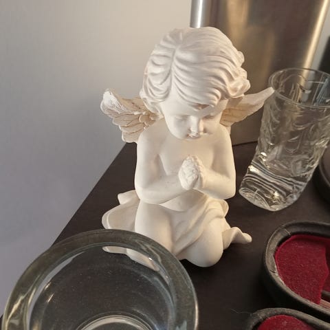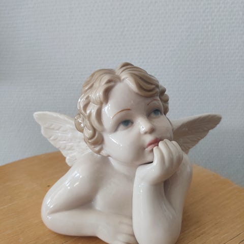 Kuvassa näkyvä enkeli patsas. Enkeli pitää käsissään kalaa. Pohjassa teksti hand made alabaster. Kaunis koriste tai keräily esine. Mitat ja kunto näkyvät kuvissa. Nouto tai toridiili.