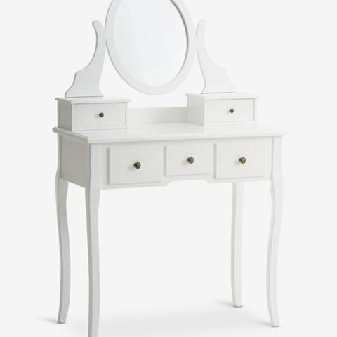 Kaunis pieni työpöytä/meikkipöytä. Irrallinen hyllykkö, joka asennettavissa myös seinälle. Pöydän koko 52 cm x 100 cm, hyllykön 16 cm x 100 cm. Pöytälevyssä ja hyllyn pohjalevyssä kulumaa, pöydän jaloissa tummentumaa ks. kuvat. Yhdessä pöydän jalassa kaksipuoleista tarraa. Yleisilme siisti. Vain nouto.