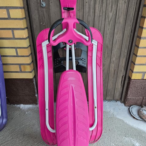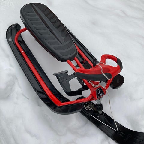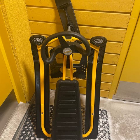 Myynnissä hyväkuntoinen Stiga rattikelkka tarpeettomana. Itsekelautuva vetonaru.
