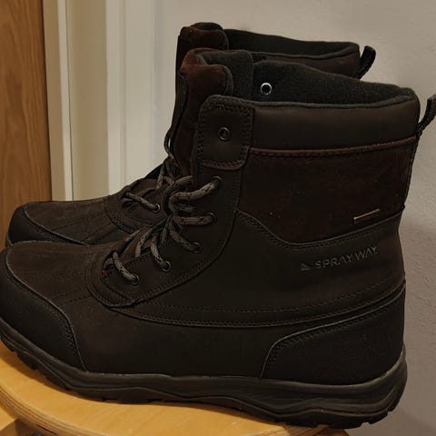 Sprayway merkkiset talvikengät, koko n. 42/42,5. Kengissä merkittynä kooksi 44, mutta itselläni on 43 kokoinen jalka ja varpaat ottavat kärkeen kiinni.