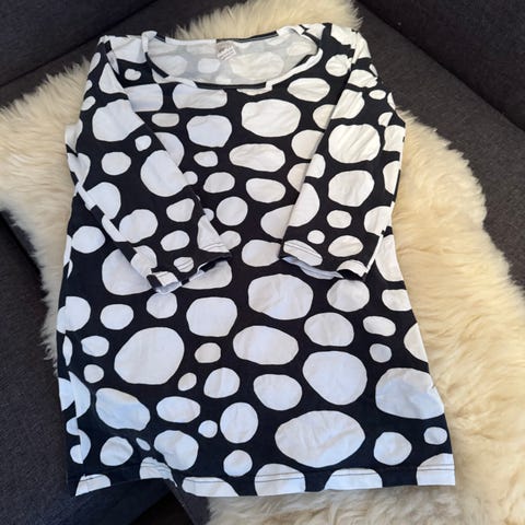 Jonkin verran haalistumaa ja helmassa joku reikä, näkyy kuvassa
