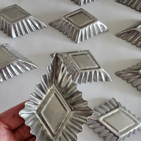 Myydään 10 kpl hyväkuntoisia vanhoja leivosvuokia. Erikseen pari kuvaa yhdestä vuoasta. Yhteiskuvassa siihen heijastuu varjo.