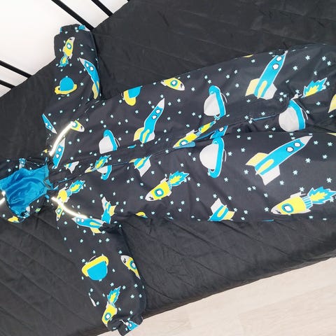 Hyväkuntoinen talvihaalari irroitettavalla hupulla. Jalkalenksut ehjät. Heijastavia yksityiskohtia.