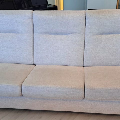 Vaalea sohva. Vekeltä ostettu, 4-5 vuotta vanha. Selkänojat ja istuinosat voi irrottaa ja pestä. Viimeksi pesty ennen joulua. Niskatuki tulee mukaan.