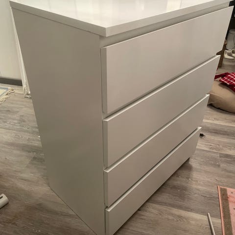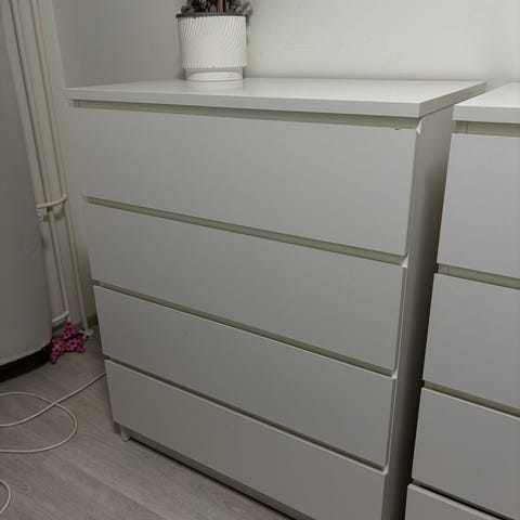 Myydään vierashuoneesssa hyvin vähällä käytöllä ollut Ikean 6 laatikkoinen valkoinen Malm-lipasto + lasilevy. Lipasto on ehjä ja siisti, mutta vasemmassa etureunassa on kannessa lasilevyn reunan kohdalla pienen pieni jälki. Jälkeä ei luonnossa kunnolla huomaa. Yritin ottaa kuvat niin, että jälki erottuisi.