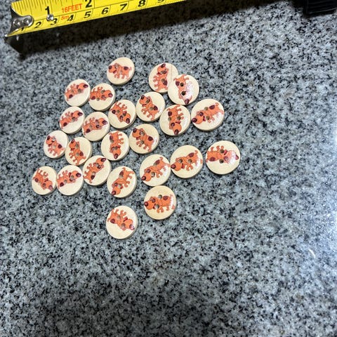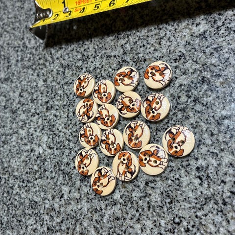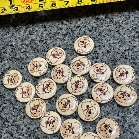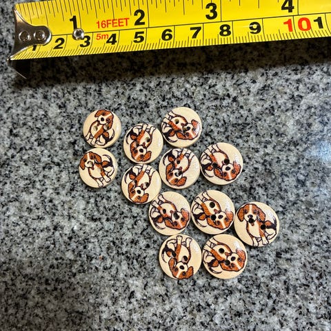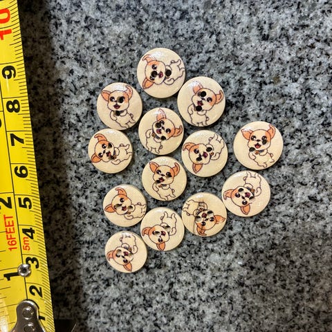 Muoviset napit, halkaisija 15 mm, jossa painettu koira-aihe. Lasten napit 26 kpl. Ruskea koira. Beige pohja.