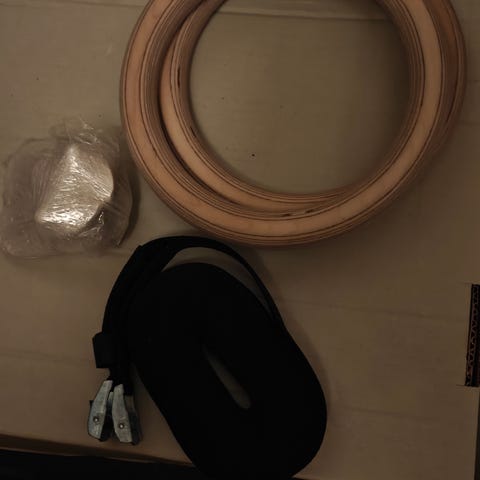 Käyttämättä jääneet Tunturi puiset voimistelurenkaat. Ostettu noin kaksi vuotta sitten ja pari kertaa olleet kiinni. Käyttöä ei ole, koska löydy paikkaa jossa roikkua.
