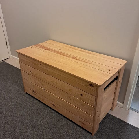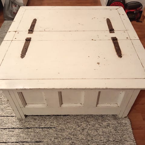 Mustaksi maalattuja arkkupöytä. Molemmin puolin avattava. Hyvä säilytys tilaa lehdille kirjoille tai vaikka lasten leluille ym.