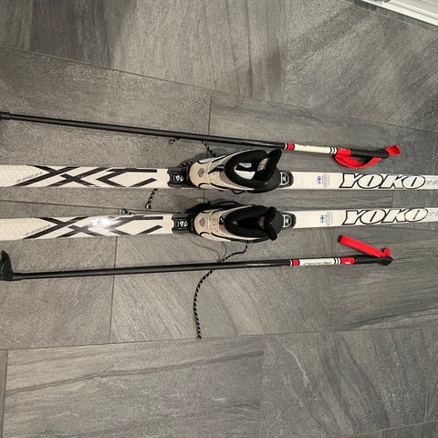 Suksipaketti: sukset (157 cm), sauvat (120 cm) ja monot kokoa 37.