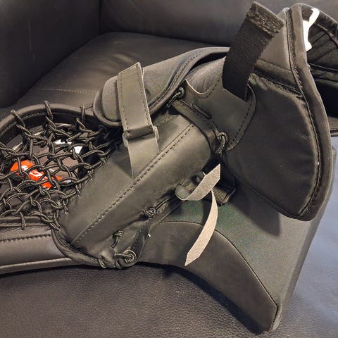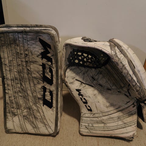 CCM YFlex 2 YTH maalivahdin räpylä ja kilpi. Useamman vuoden käytetty räpylä, on kuitenkin vielä täysin hyvässä kunnossa. Narut aikoinaan ammattilaisella laitettu uudestaan, jotta on sopivan helppo pienemmän pelaajan avata ja sulkea. Kilpeä käytetty vuoden verran vähemmän. Hanska osa täysin ehjä.