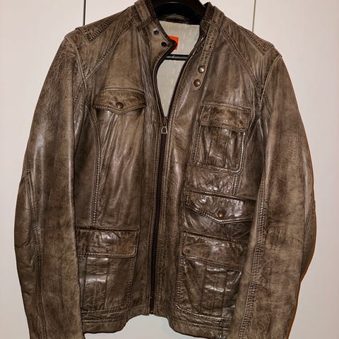 Hugo Boss musta nahkainen takki, koko XL. Takissa on vetoketjullinen etuosan suljenta ja sisätasku. Kaikki taskut ovat ehjiä. Takissa on tikatut yksityiskohdat olkapäillä ja helmassa. Erittäin hyvässä kunnossa, savuton talous.