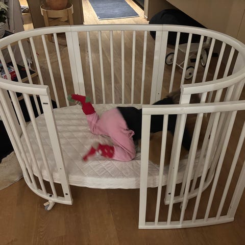 Stokke pinnasänky, pyöreä muotoilu ja puinen runko. Sopii vauvan nukkumiseen ja tarjoaa turvallisen ympäristön. Mukana patja ja vuodevaatteet.
