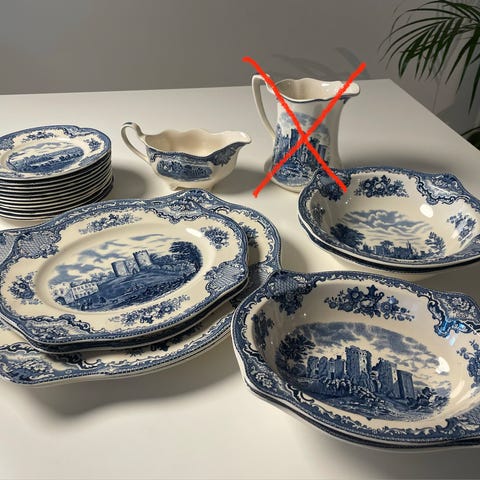 Englantilaiset Johnson Brothers Old Britain Castles sarjan vihreät lautaset, The Castle Story -kuviolla. Viisi pientä lautasta ja yksi iso lautanen. Pienten halkaisija 17,5cm ja ison halkaisija 22cm. Kaikki ehjiä.