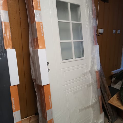 Tummanharmaa, koko 10x23, vasenkätinen. Toinen samanlainen ovi valkeana. Molemmat uusia paketissa. Valk ovesta ei kuvaa, koska on toisen oven takana paketissa. 350€/kpl.