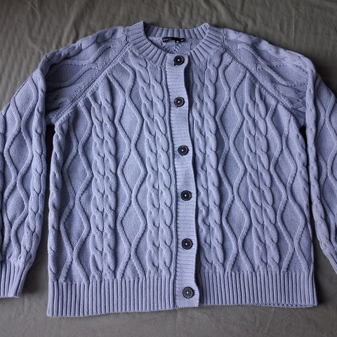M neulottu lyhyt neuletakki. Edestä avoin malli. Hihat levenevät alaspäin.