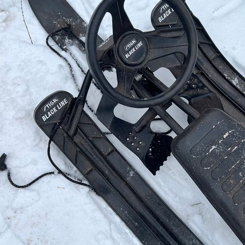 Hyvä rattikelkka lapsille ja lapsenmielisille. Käytännössä yhden hengen kelkka, jolloin pystyy käyttämään kelkan jarrua (Jyrkässä mäessä kantapäät toimivat yleensä varmemmin). Laatikon kyljessä kuvat kelkan ominaisuuksista.