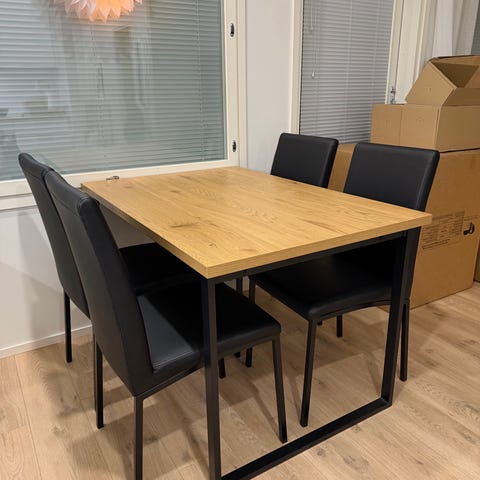 Maskusta syksyllä ostettu ruokailyryhmä, ovh 315€. Myydään koska vie liikaa tilaa asunnosta. Kaikki neljä tuolia on, ei vaan mahtunut kuvaan. Muuten hyvä ja toimiva ruokailuryhmä☺️