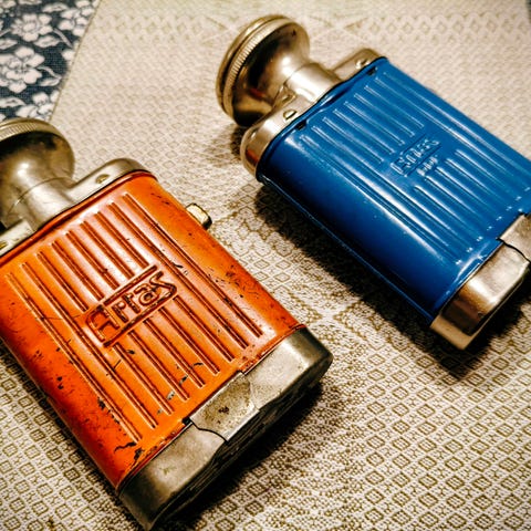 Punainen, hieman patinoitunut taskulamppu ilman patteria.