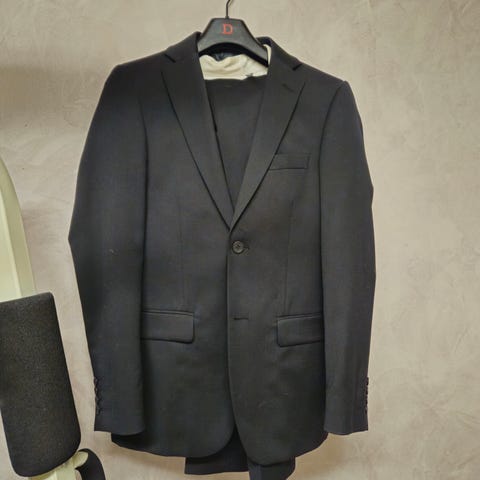Myydään puku vaikka rippipuvuksi tai muihin juhliin. Lahkeet kertaalleen käännetty itse, kun olivat aikanaan liian pitkät. Vekki helposti purettavissa.