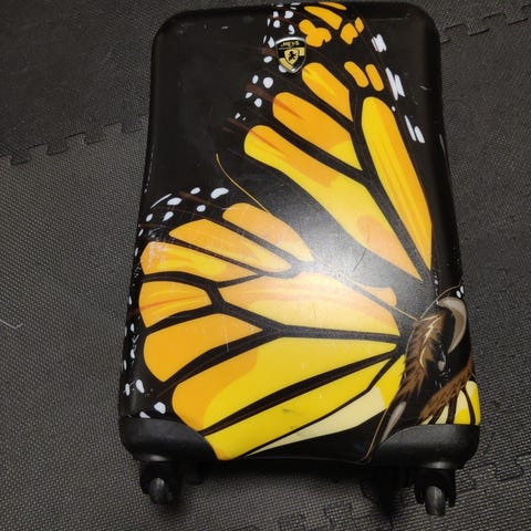 Hyväkuntoinen neljällä pyörällä varustettu kookas kankainen matkalaukku.