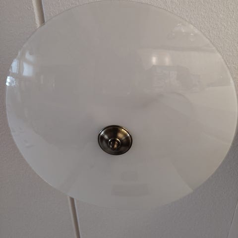 Vanha, laadukas ja hieno kattovalaisin. Messinkiä ja puuta. Kiillottamalla saa kullan väriseksi. Joku on joskus yrittänyt vähän kiillotellakkin.