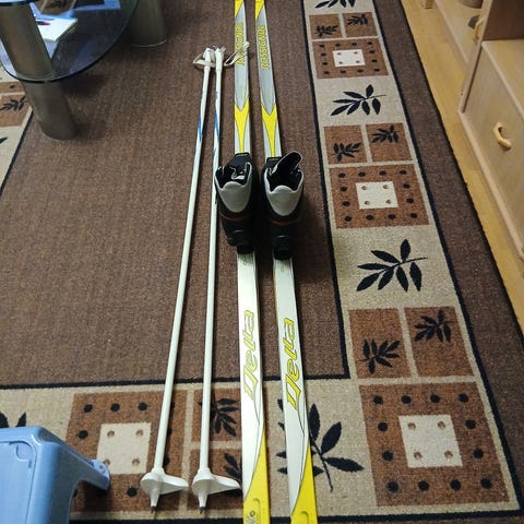 Sukset 110, sauvat 80 ja monot koko 29. Suksissa pohjat aika kuluneet.