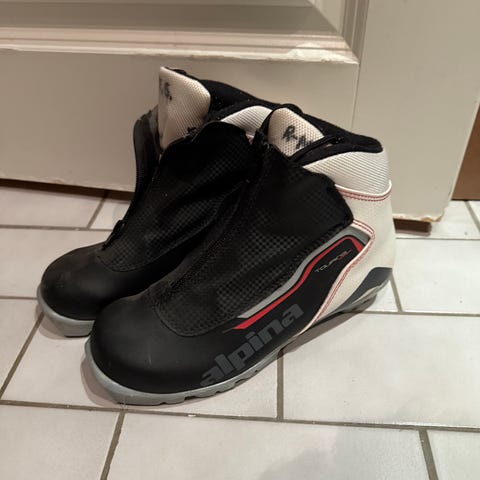 Alpina hiihtokenkä harmaalla värillä. Kenkässä on vetoketjullinen etuosan suljenta ja tukeva pohja. Käytetty kunto, kengän takaosan materiaali on kulunut ja irtoaa. Samoin läpissä kulumaa. Sisämitta 23.5 cm