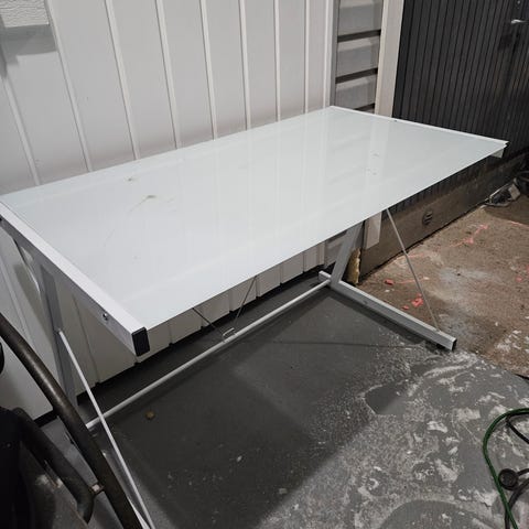 Annetaan valkoinen koulupöytä. Jonkin verran käytönjälkiä, ainakin yksi puutappi puuttuu ja kaipaisi useamman ruuvin. Laatikot toimii. Luovutetaan purettuna. Korkeus 73cm, leveys 120, syvyys 48cm.
