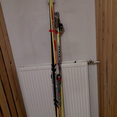 Peltonen merkkiset sukset, pituus 160 cm, väri sinivalkoinen, NNN siteet. Sauvat ja monot kokoa 35.