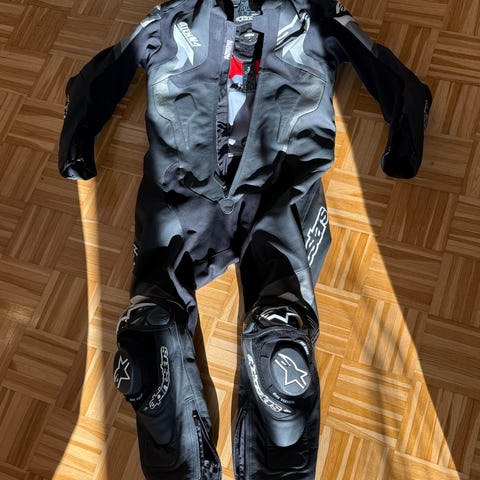 Alpinestarsin laadukas, kaksiosainen nahkapuku. Takki ja housut kokoa 52.