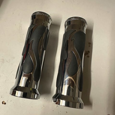 Moottoripyörän kiiltävää billettiä olevat kahvat ja kiinnitys kahvalle plus ryyppykahva tai puolipuristin. Tuuman tankoon