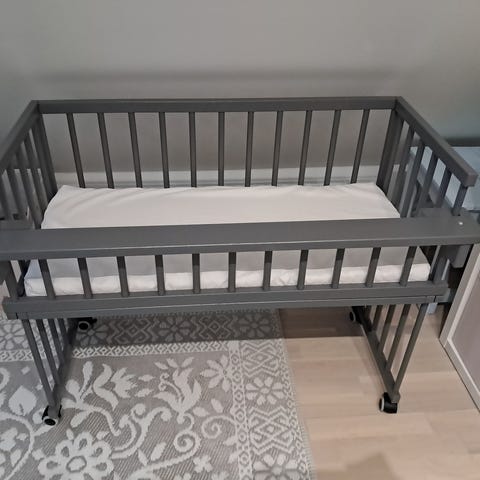 Toisen laidan saa alas. Jalakset saa keinumaan tai pysymään paikallaan, renkaat saa lukittua. Sängyn voi säätää eri tasoille tai kuten kuvassa, pääty pää ylempänä kuin jalkopää. Alla hyvin säilytystilaa. Mukaan patja, kosteussuoja ja muotoonommeltuja lakanoita ainakin yksi, enemmänkin jos vain löydän muuton jäljiltä 😅 patjan päällä aina ollut kosteussuoja joten patja on kuin uusi.