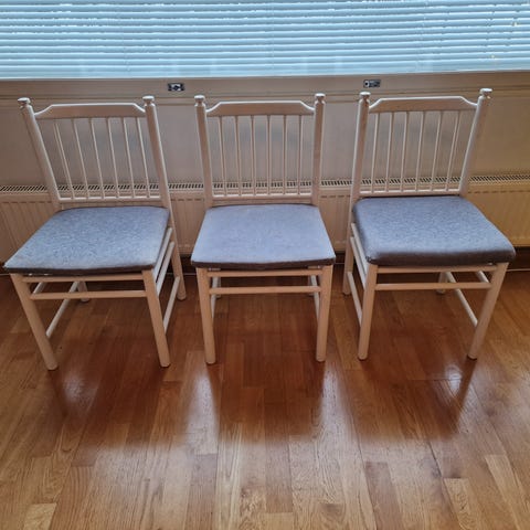 Myytävänä kaksi täyspuista tuolia. Rakenteeltaan hyvässä kunnossa, mutta maalipinta vähän kulunut.