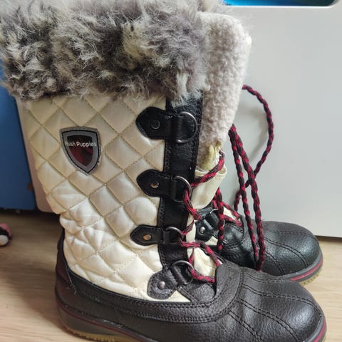Yhdellä lapsella käytössä olleet nahkanilkkurit, talvimaiharit