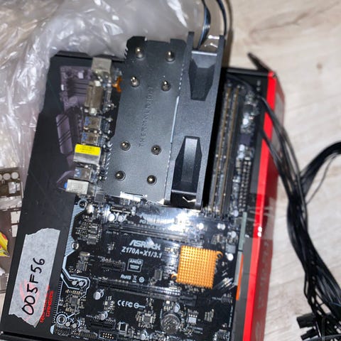 Asrock Z170A-X1/3.1 emolevy. Kuvissa näkyy emolevy ja siihen liitettyjä komponentteja, osina toimii