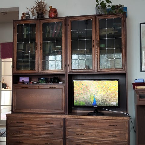 Ehjä kirjahylly lasiovilla.