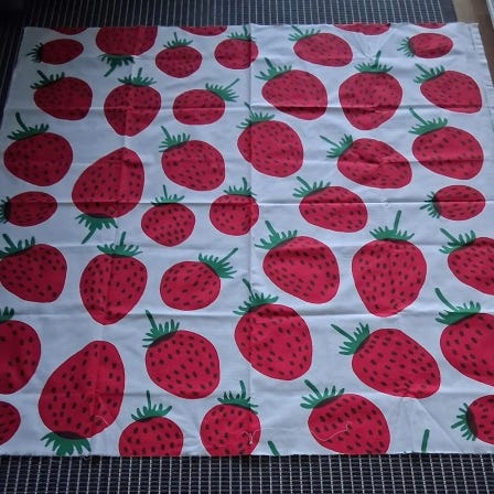 Mansikkavuoret puuvillakangas, leveys 150 cm, pituus 72 cm.