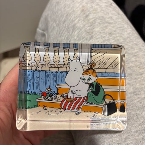 Iittala Muumi lasikortti, jossa on Muumipeikko. Mukaan tulee kuvan ostopakkaus