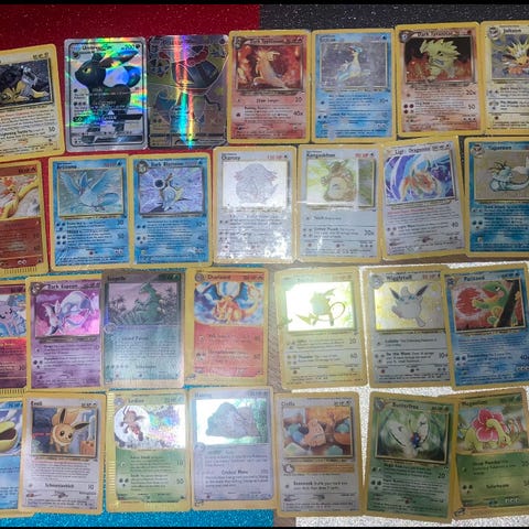 Vanhoja Pokémon -kortteja. Osa siistissä kunnossa, osa ei. Muutamat muoveissa suojassa.