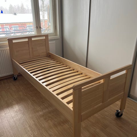 Lakattu koivusänky, jossa mukana myös peruspatja (10cm), jossa kosteutta hylkivä suoja vetoketjulla, sekä nousutuki. Kunto on erittäin hyvä.