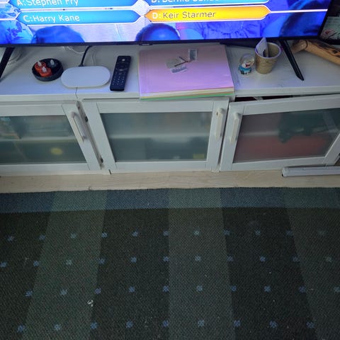 Lundian tv-taso ovilla. Takana ristikko yhdellä puolella eli avoin taka. Valkoinen taso. Pientä kulumaa löytyy, muuten hyväkuntoinen.