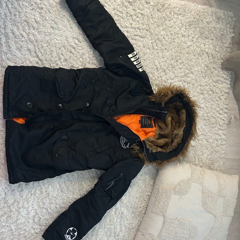 Tyylikäs laivastonsininen uuden veroinen Alpha Industries talvitakki. Irrotettava karvakaulus. Malli sopii miehille ja naisille. Takki on naisten kokoa L, vastaa miesten koossa noin S kokoa.